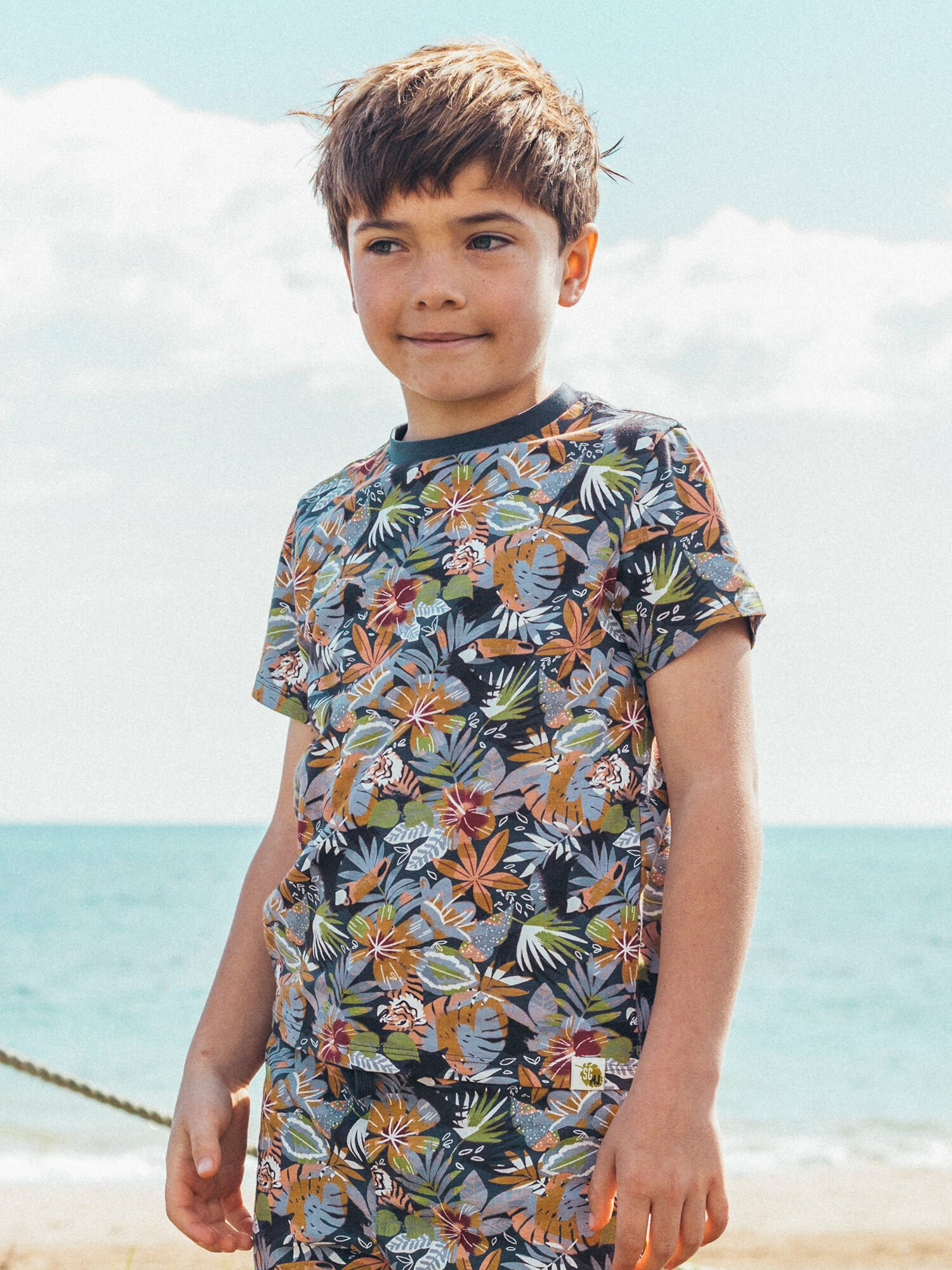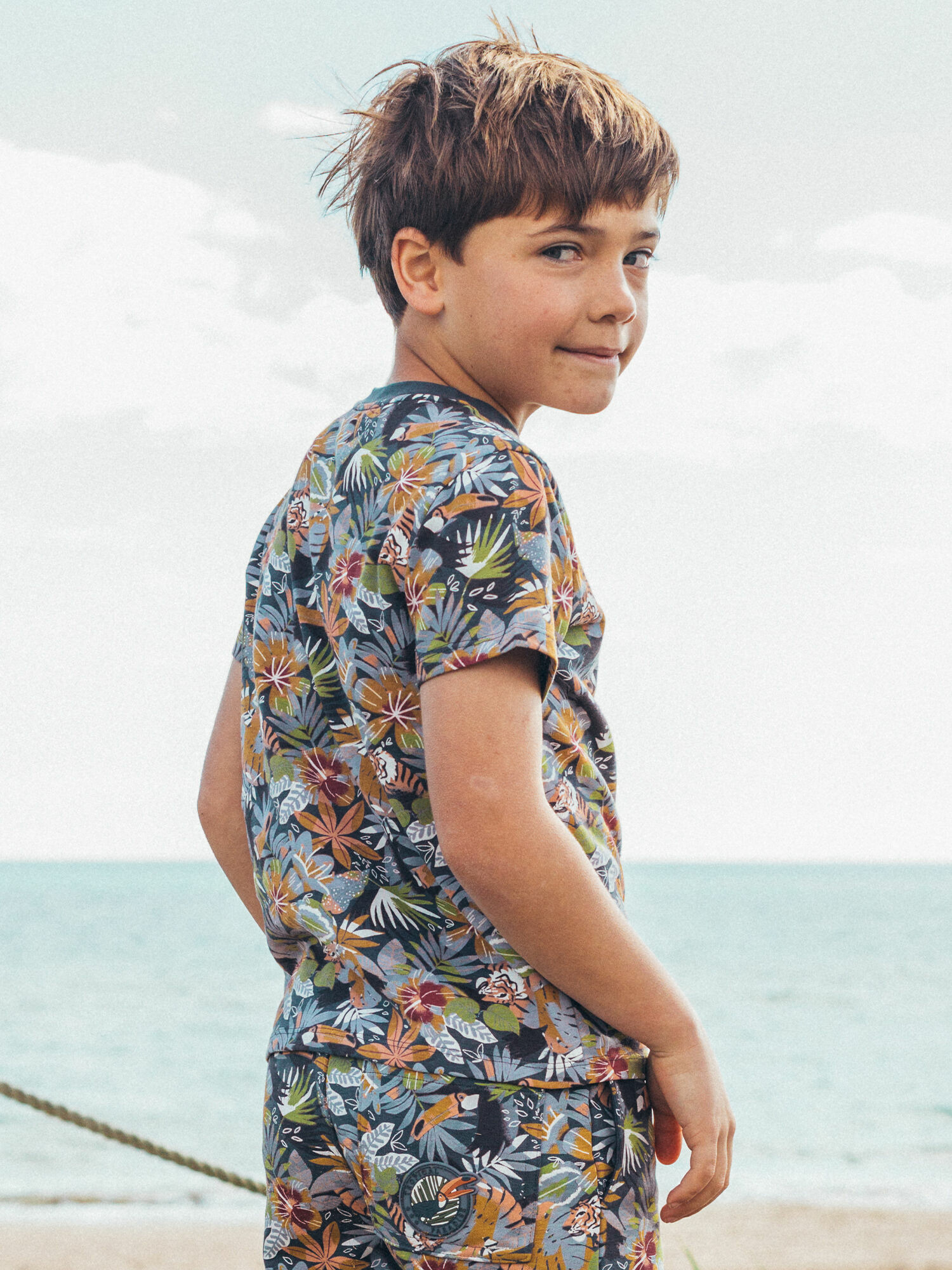 Confectionné en coton doux, ce t-shirt léger garantit une sensation agréable sur la peau, même lors des journées les plus chaudes. Son col en bord-côte assure une tenue parfaite et durable, tandis que le motif tropical coloré dynamise le look avec une note exotique qui invite au voyage. Idéal pour les enfants actifs, il s’intègre parfaitement à la collection Sable Noir, synonyme de qualité et de style.