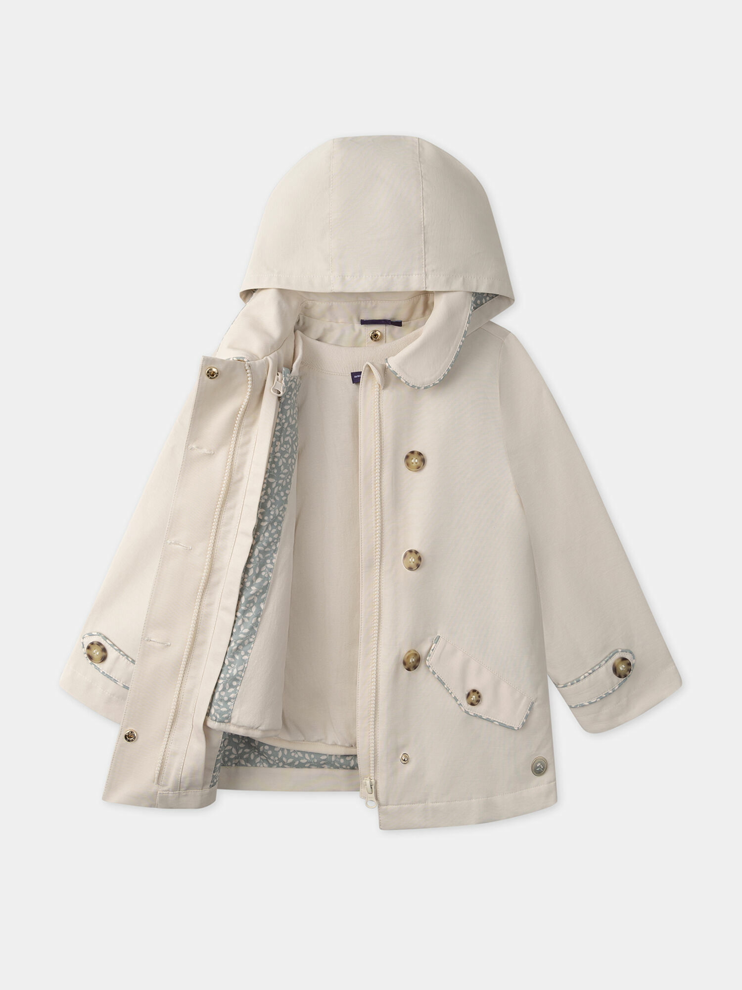 Le trench est équipé d’un zip frontal, de double rangées de boutons pour un maintien optimal, et d’une veste intérieure matelassée sans manches. Le ciré est doté d’une capuche pratique et d’un tissu déperlant pour une protection efficace contre la pluie.