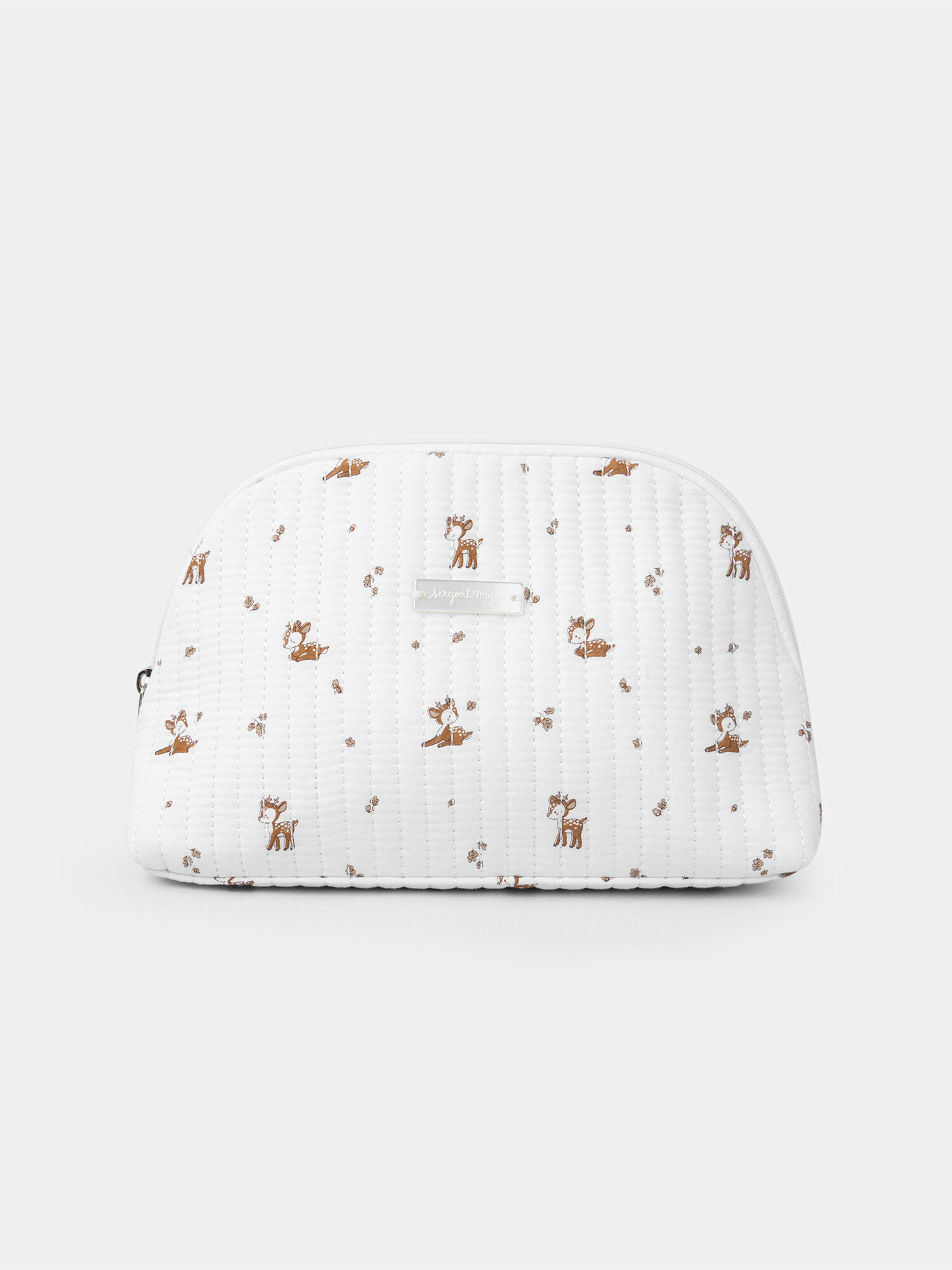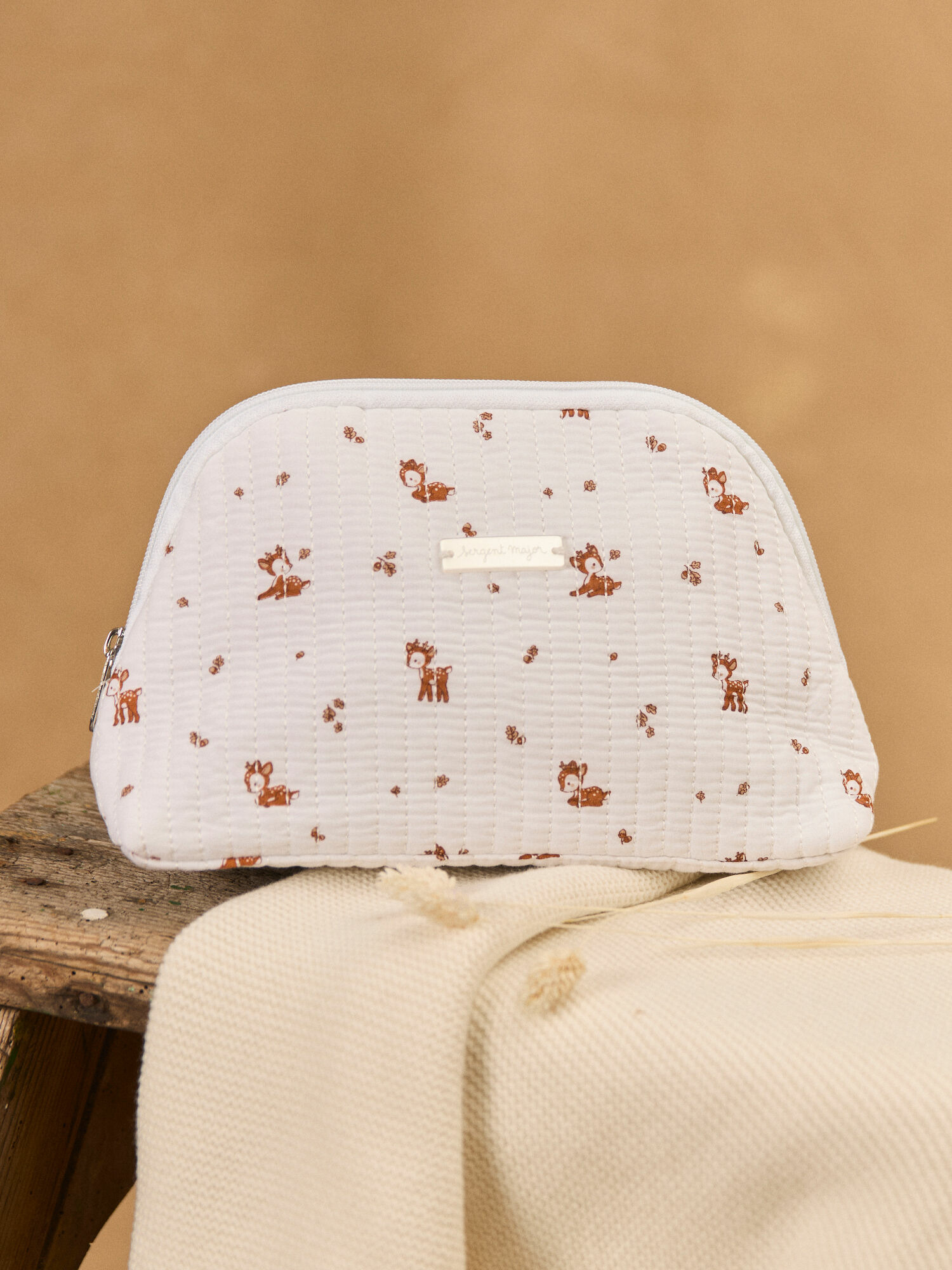 Confectionnée en popeline imprimée de faons aux teintes caramel et noisette sur fond écru, cette trousse évoque la douceur d’une promenade en forêt. La surpiqûre matelassée apporte relief et texture, tandis que la plaque en résine gravée "Sergent Major" signe son authenticité. Son intérieur doublé, facile à nettoyer, garantit une hygiène parfaite pour les essentiels de bébé.