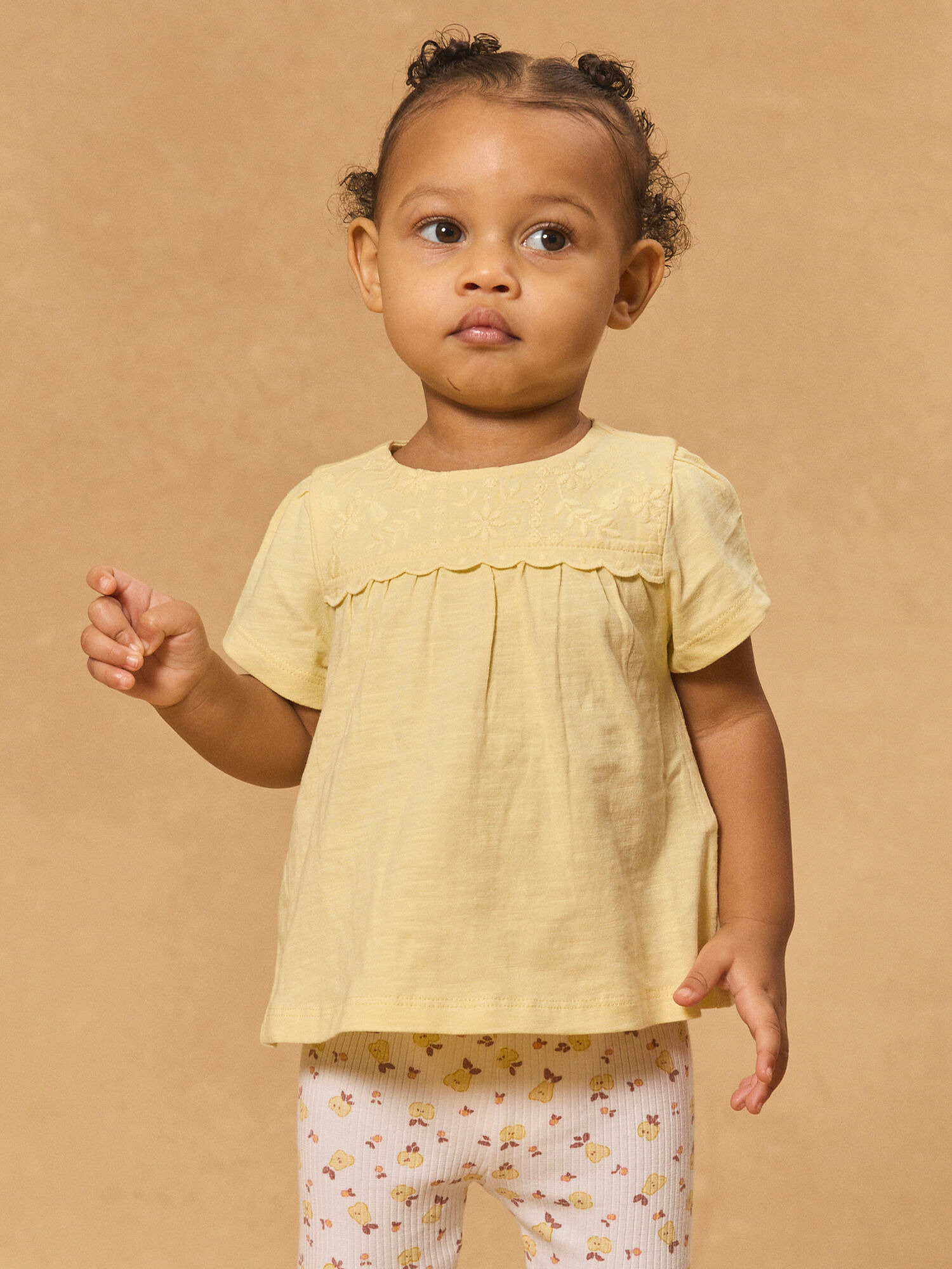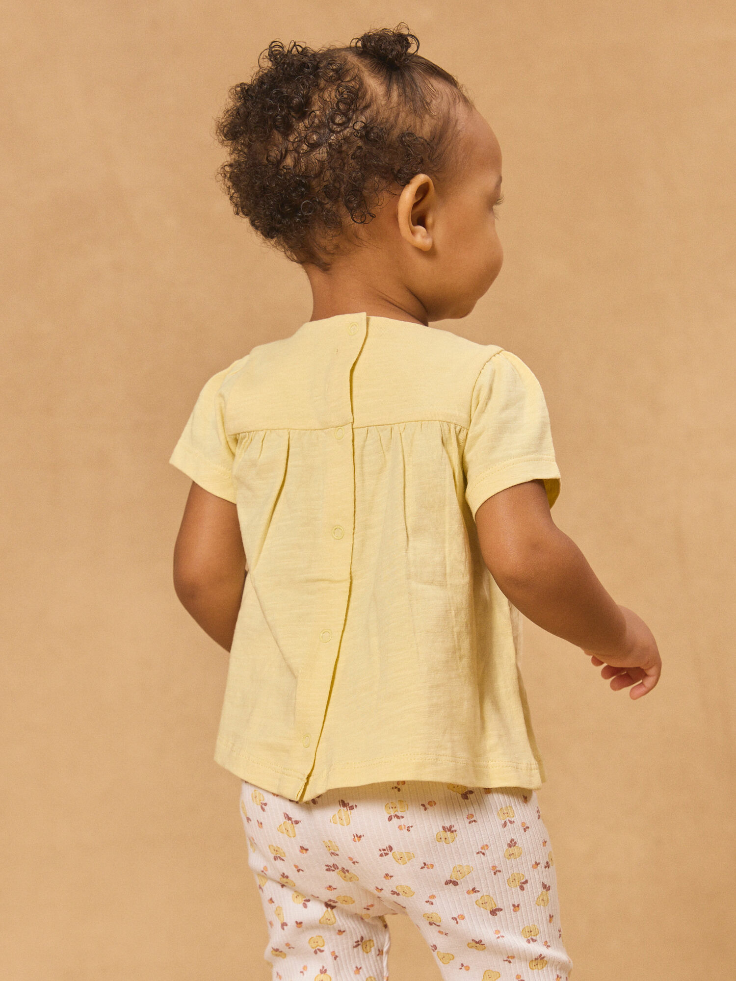 Empiècement brodé fleuri sur le buste avec finition coquille, ouverture dos intégrale à pression pour un habillage facile. Ce t-shirt fait partie de la collection Jaune de Tournesol, référence MANICOLE / 25E1BFK1TEEB104. Pour découvrir ses qualités et caractéristiques environnementales, consultez la fiche produit dédiée.