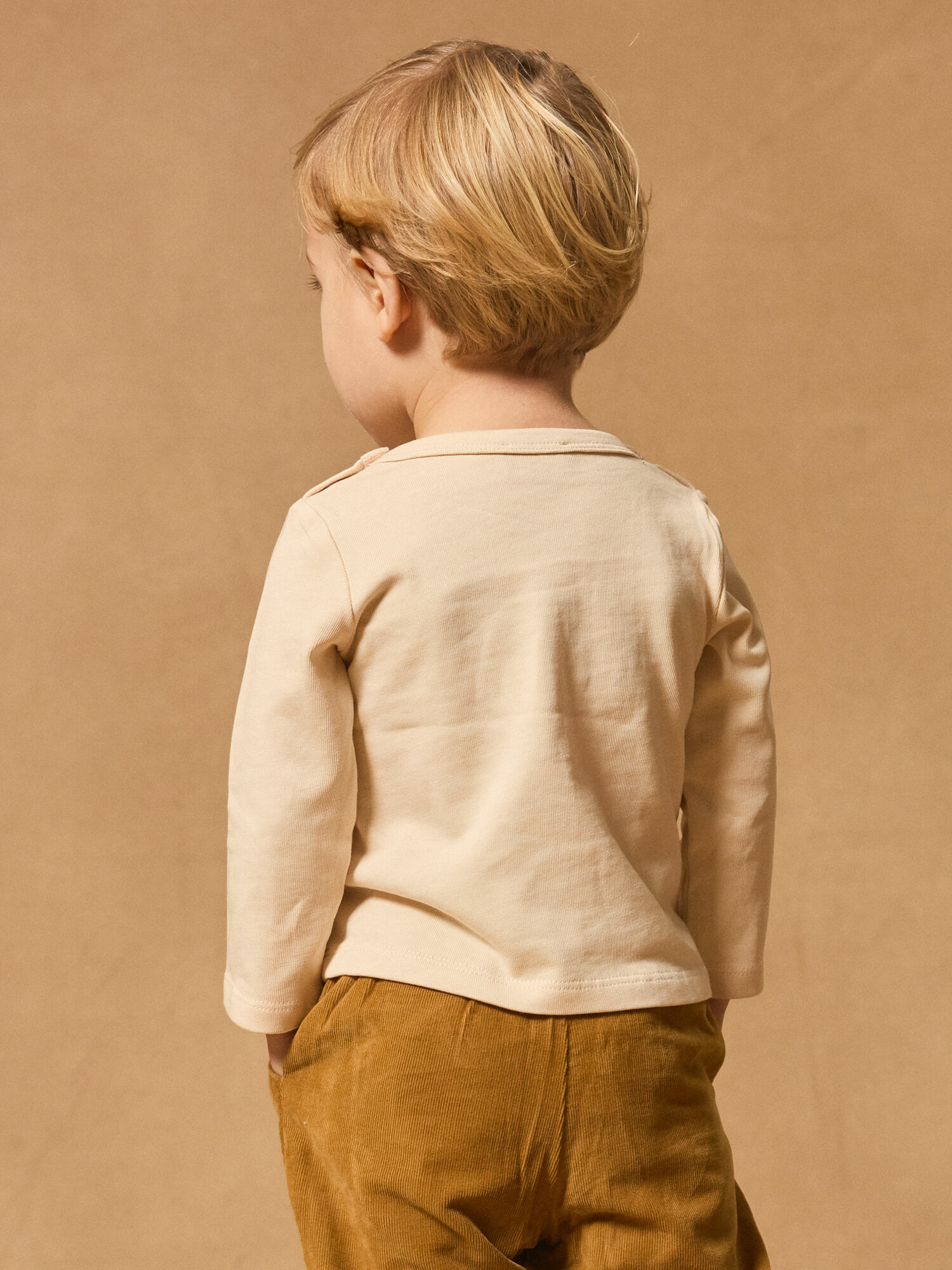 Conçu pour faciliter l’habillage, ce T-shirt dispose d’une ouverture au col par boutons à pression, pratique et sécurisée. Sa teinte vanille lumineuse met en valeur le motif « mon bébé Lion d’amour », apportant une touche affectueuse et originale à la tenue de votre enfant. Idéal pour les journées fraîches, il accompagne avec délicatesse chaque mouvement de votre bébé.