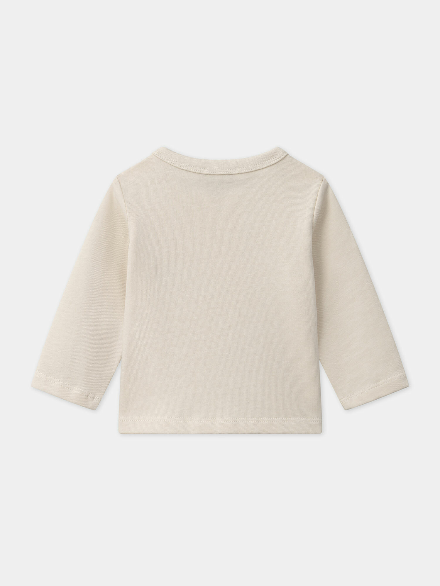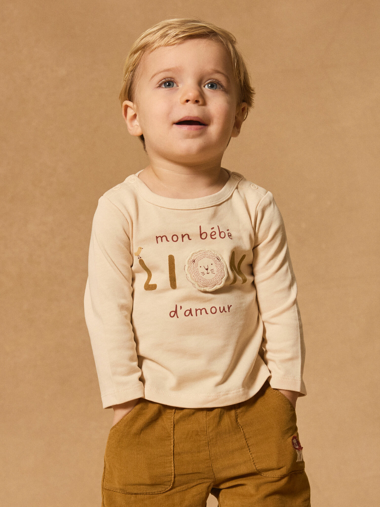T-shirt à manches longues vanille. Inscription « mon bébé Lion d’amour » avec patch lion dans les tons marrons. Ouverture du col par boutons à pression pour un habillage facile. Référence : MAACHILE / 25E1BG71TML114. Ce produit appartient à la Terre de Chardons, engagement environnemental consultable via la fiche produit.