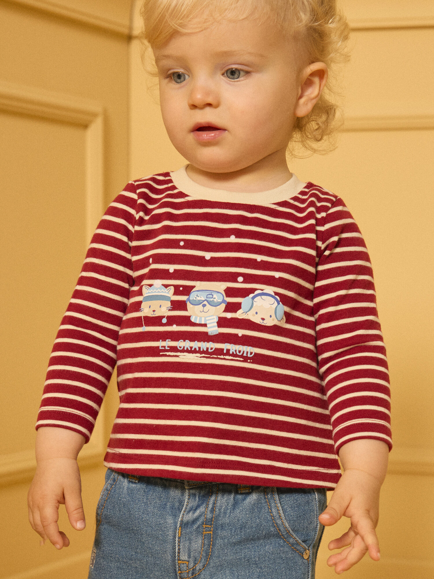 Fabriqué dans le cadre de la collection Fruit confit à Varsovie, ce T-shirt à manches longues rayé est doté d’une ouverture dos intégrale par boutons à pression. Il présente un imprimé texturé d’animaux sur le buste, dans des tons bleu ciel, blanc et beige, avec une matière grattée à l’intérieur pour plus de douceur. Référence : LASAMUEL / 24H1BGR1TML501.