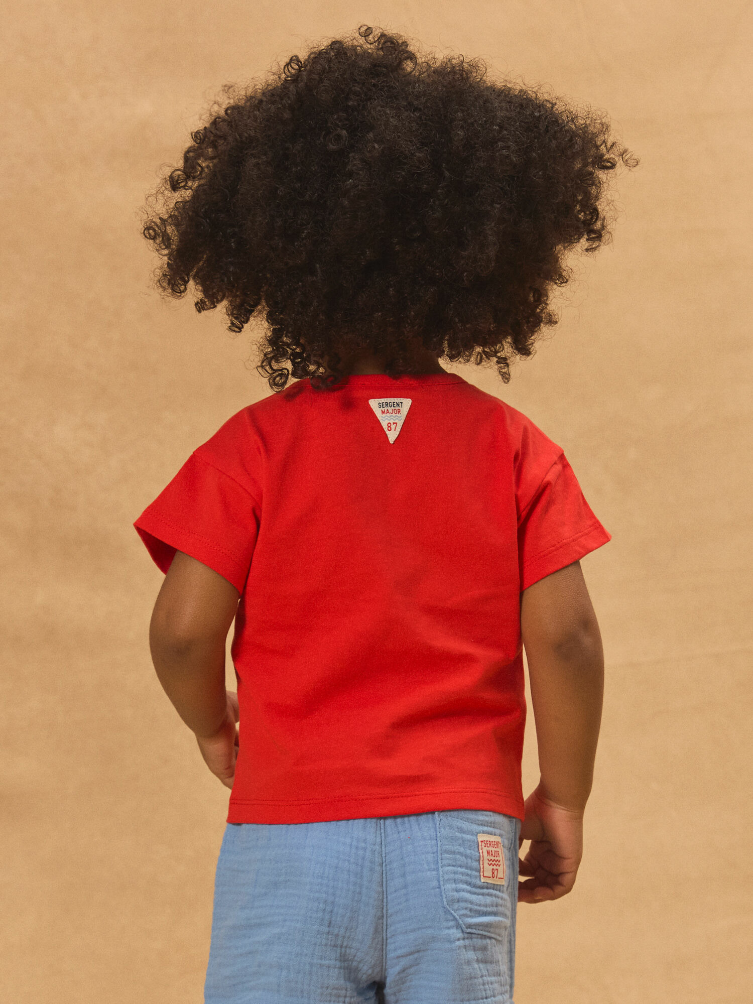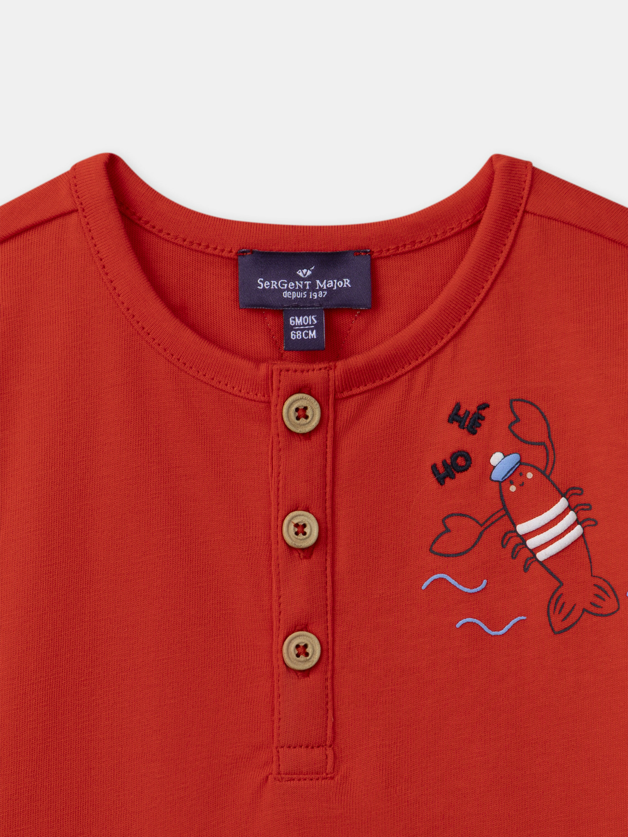 Un t-shirt rouge audacieux pour les petits explorateurs qui aiment la mer et l’aventure. Crabe et homard texturés apportent une touche marine originale et pleine de caractère.