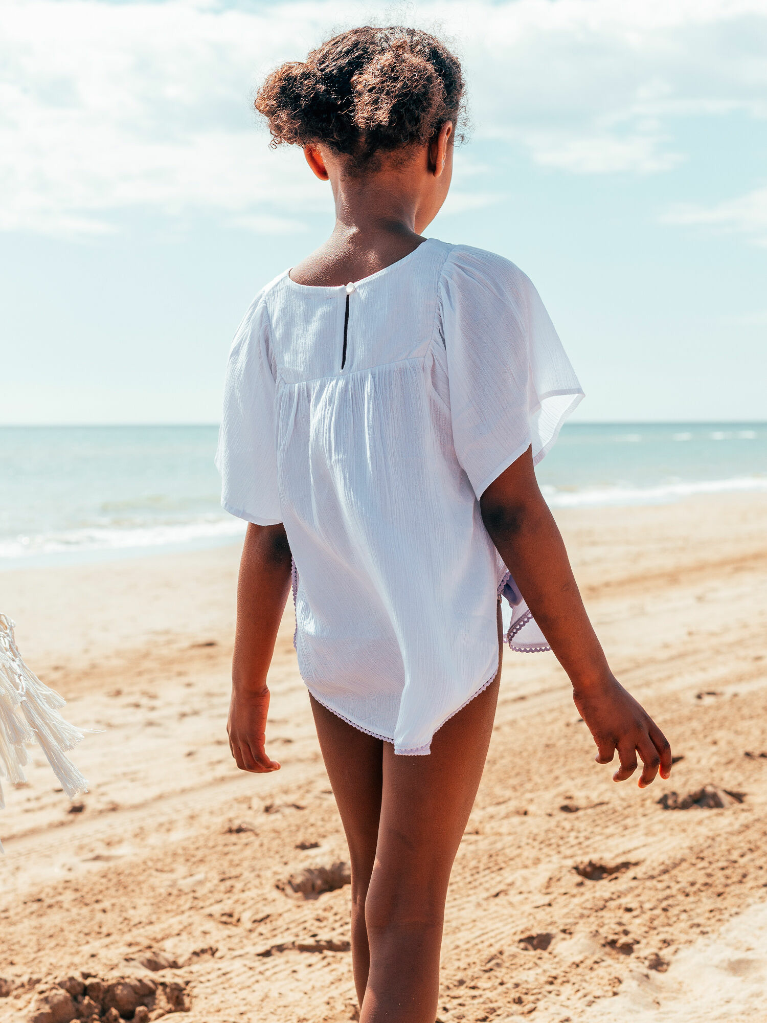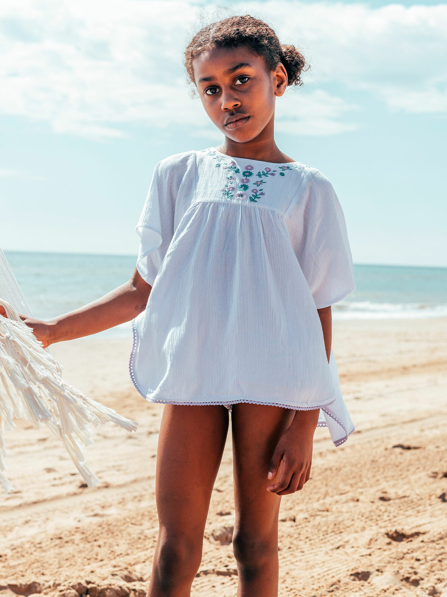 Cette tunique fait partie de la collection Plage de Sergent Major. Elle est repérée sous la référence MRUKAFETTE / 25E4PFC3TDP001. La finition croquet et la broderie sur l’encolure sont les éléments clés de son design.
