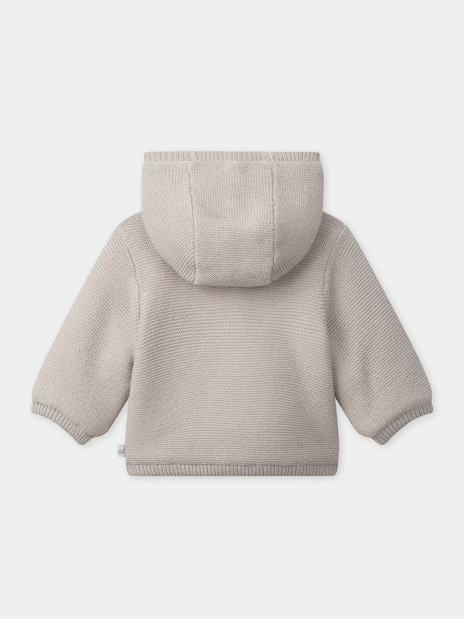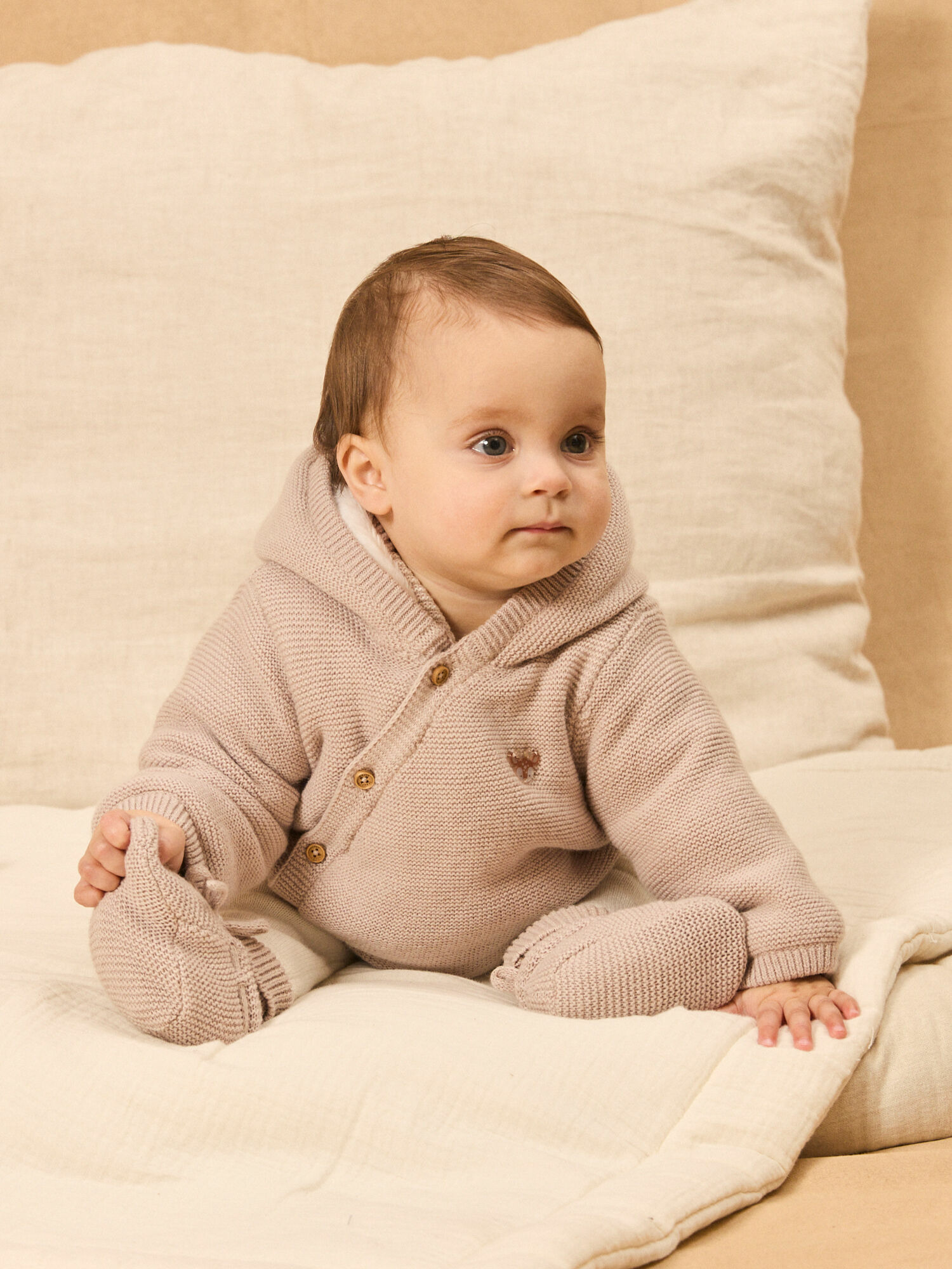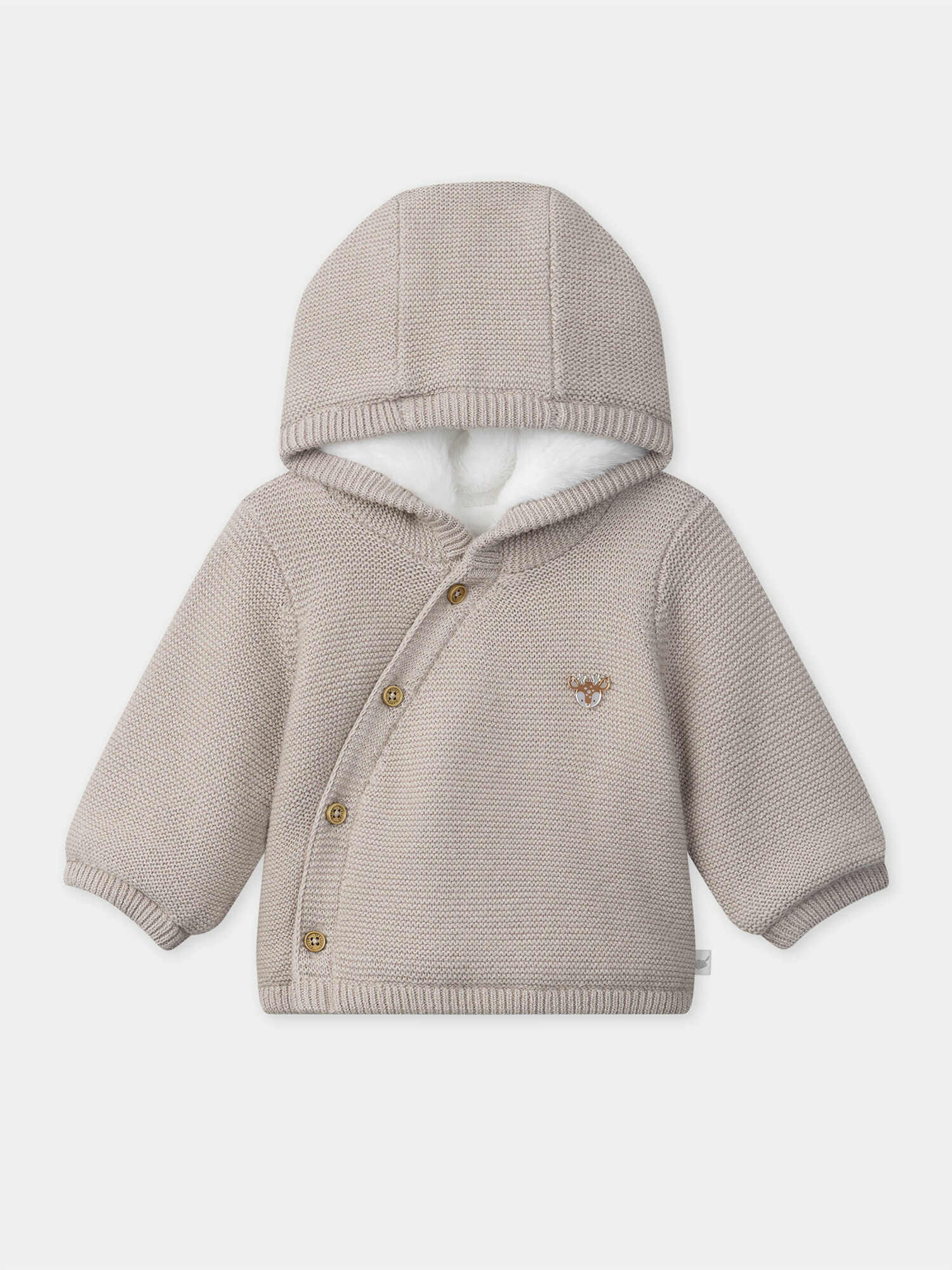 Référence NOFEL / 25H0CM21VESI814. Veste en tricot sépia contenant de la laine, doublure en fourrure synthétique écrue. Ouverture cache-cœur arrondie avec boutons en bois naturel gravés. Finitions bord-côte sur bas, manches et capuche. Badge faon en résine sur le buste. Étiquette cadeau faon incluse. Languettes intérieures avec boutons pour maintien des pans.
