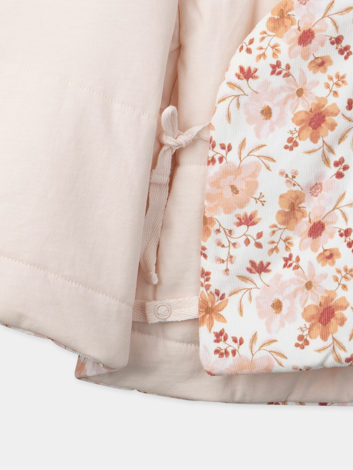 Velours côtelé imprimé floral dans les tons rose poudré, orangé, groseille, corail et brun doux sur fond écru. Doublure en jersey rose poudré. Ouverture avant arrondie avec bouton en nacre gravé et boutons pression invisibles. Revers de manches fixés pour faire ressortir la doublure. Léger matelassage. Languette à nouer et bouton pression intérieur pour maintenir les pans. Référence NOUCHKA / 25H0CF21VES001.