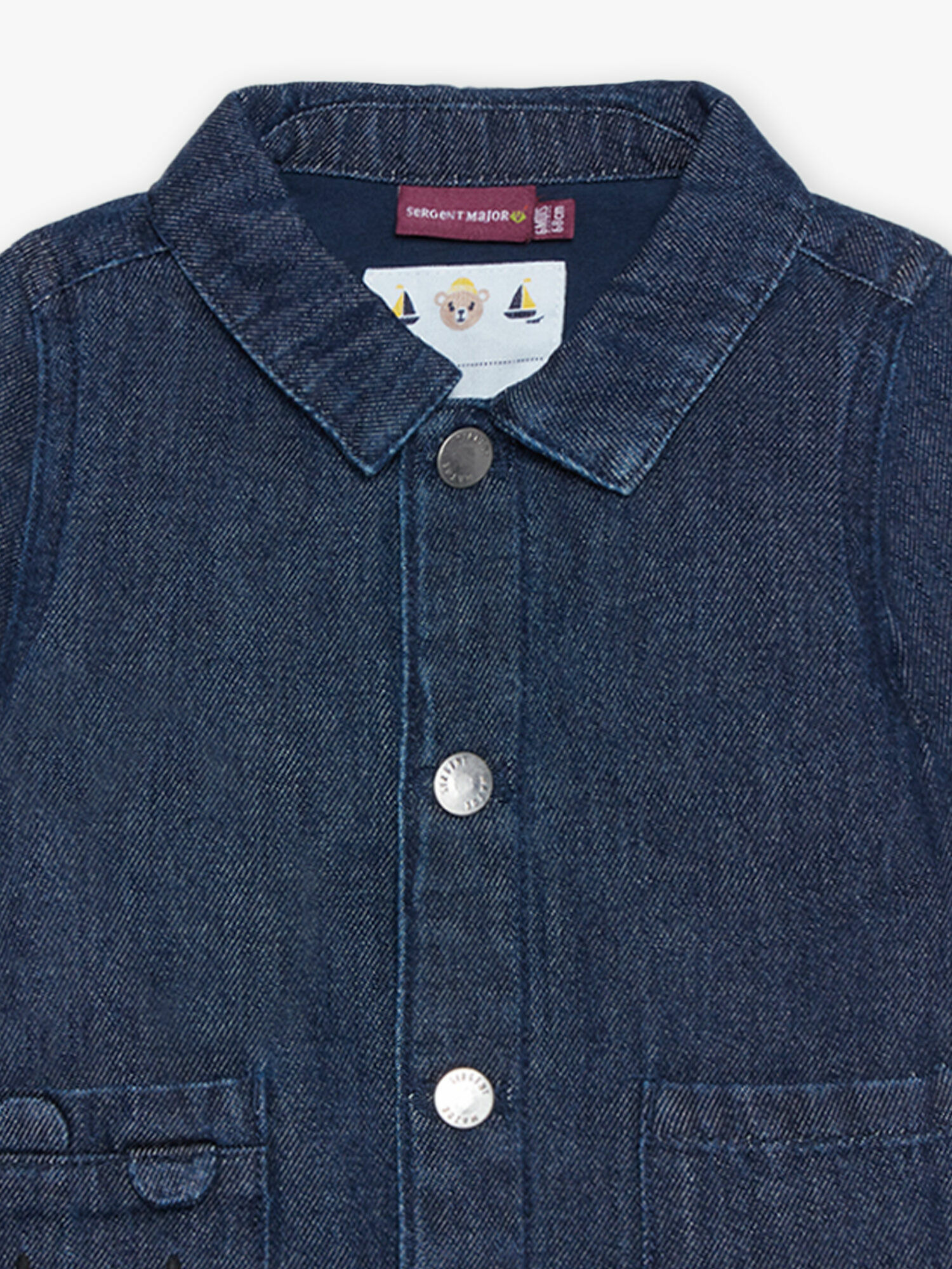 Conçue en denim bleu robuste, cette veste se distingue par son intérieur en jersey bleu marine, garantissant chaleur et souplesse. Les détails ludiques, comme les oreilles en 3D découpées et les poches brodées d’un visage d’animal, apportent une touche de fantaisie qui plaira aux petits comme aux parents. La vignette tissée Baby 1987 Sergent Major à l’arrière affirme son authenticité et son appartenance à la collection Grosses Pièces, synonyme de qualité et de style.