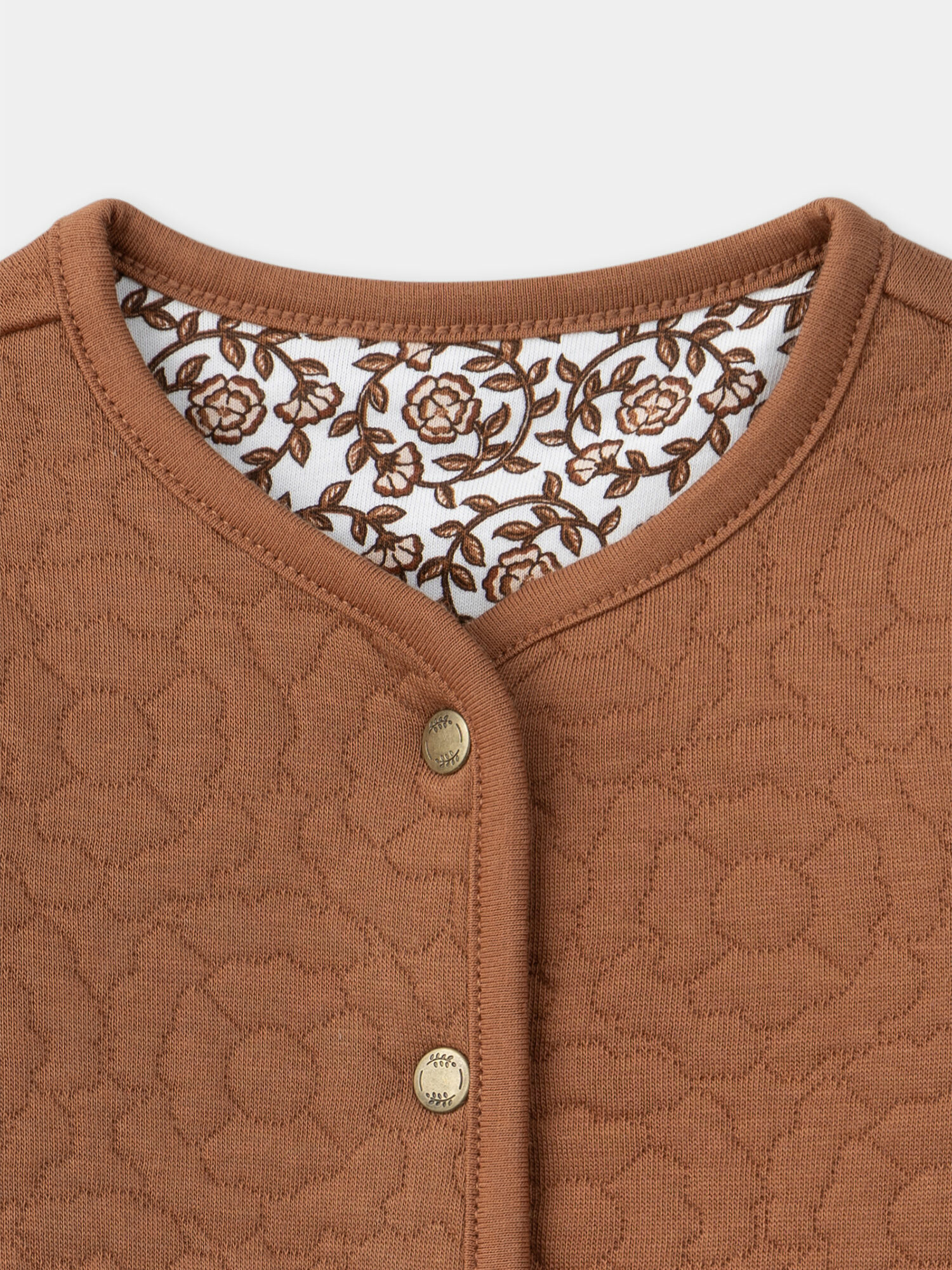 Conçue dans un tubique matelassé marron, cette veste allie douceur et chaleur légère, idéale pour les transitions climatiques. Les poches avant, ornées d’imprimés fleuris et d’un badge fleur, ainsi que les revers de manches assortis, soulignent un esprit délicat et moderne. L’intérieur révèle un imprimé floral marron sur fond écru, signature discrète de la collection Caramel à Londres, qui sublime chaque mouvement.