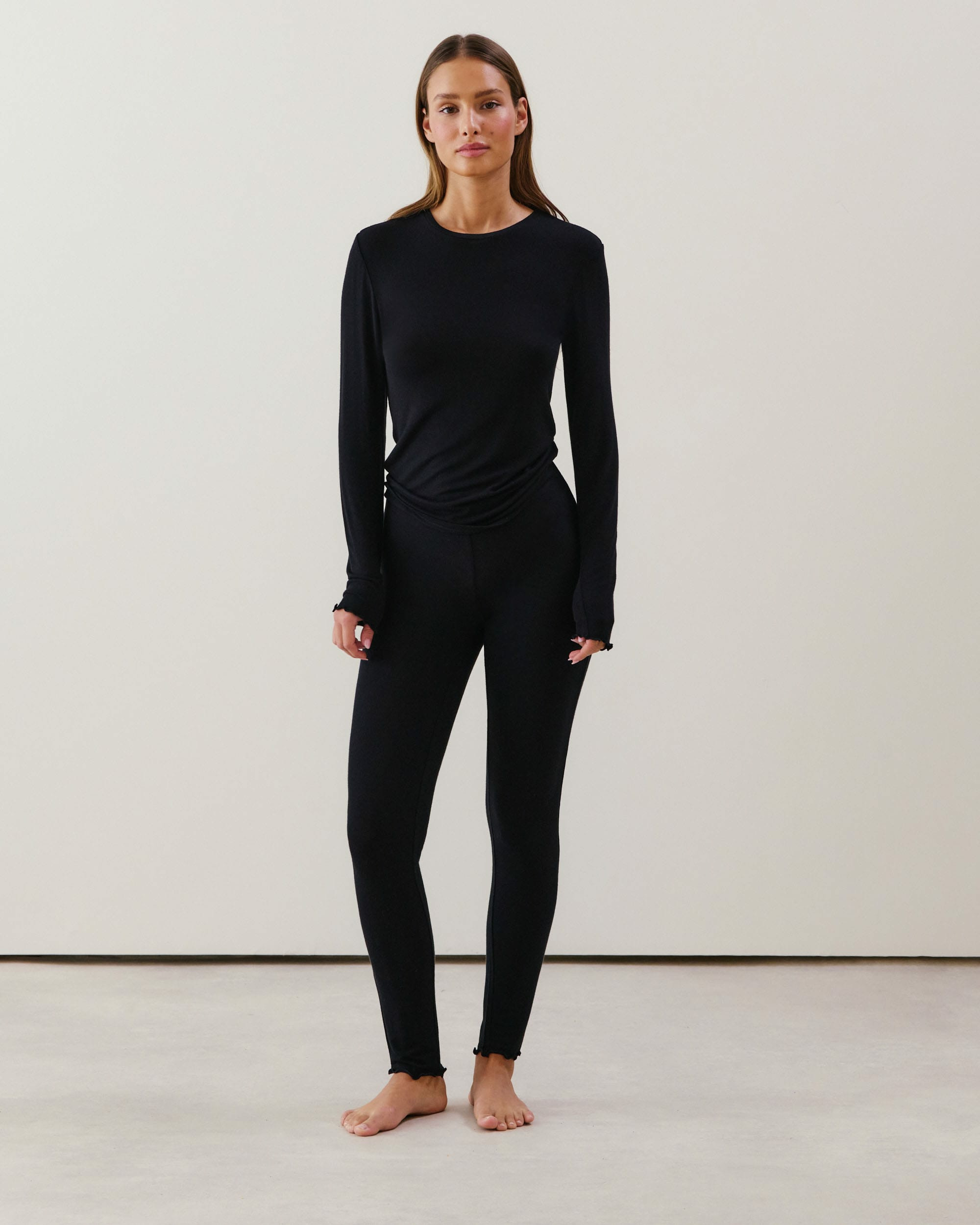 Confectionné dans un jersey doux et extensible, ce legging épouse parfaitement les formes sans comprimer. Sa teinte noire intemporelle facilite les associations, tandis que sa coupe ajustée offre une silhouette élégante même à la maison. Léger et respirant, il accompagne vos nuits comme vos journées avec une aisance remarquable.