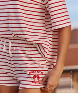 Adoptez un style décontracté et iconique avec ce short marinière en jersey épais, sublimé par une broderie Hello Kitty. Une pièce qui allie confort et originalité pour vos looks d’été.