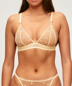 Fabriqué en mesh transparent avec broderies citron, ce soutien-gorge dispose de bretelles réglables et d’une fermeture dos classique pour un ajustement personnalisé. Sa composition légère garantit souplesse et confort, tout en valorisant la finesse des détails.