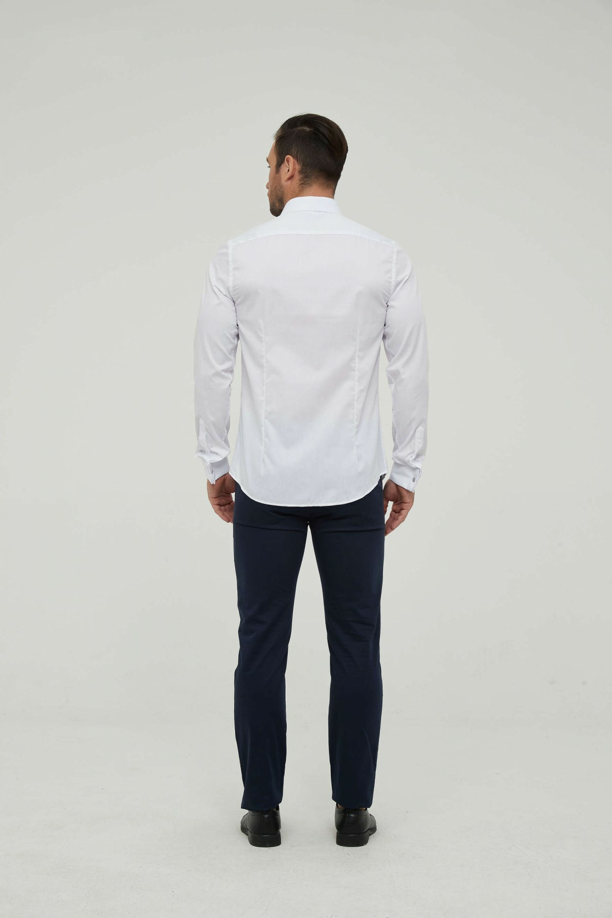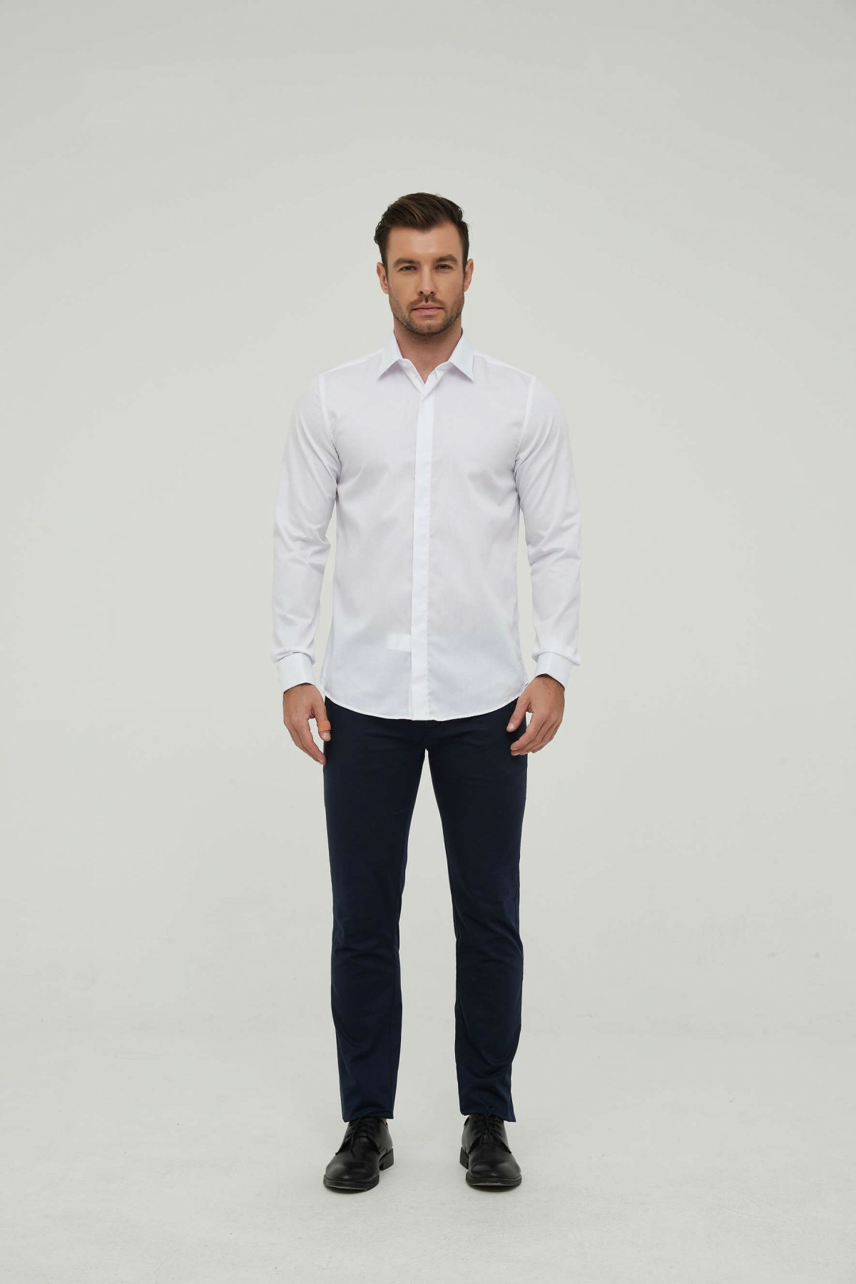 Conçue pour épouser parfaitement votre corps grâce à sa coupe cintrée, cette chemise se distingue par son col français et sa boutonnière cachée qui offrent une allure épurée et sophistiquée. Les poignets mousquetaires, accompagnés d’une paire de boutons de manchettes, apportent une touche de prestige et de distinction, idéale pour vos occasions formelles ou professionnelles.